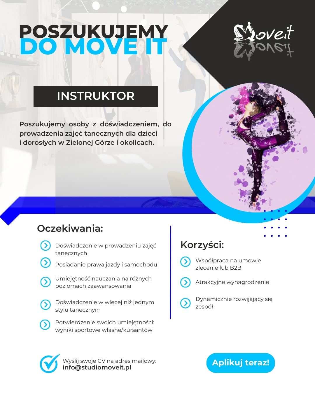 Studio Move It poszukuje instruktora tańca, który z zaangażowaniem poprowadzi zajęcia dla dzieci i dorosłych w Zielonej Górze i okolicach.
